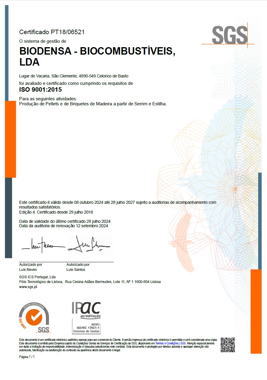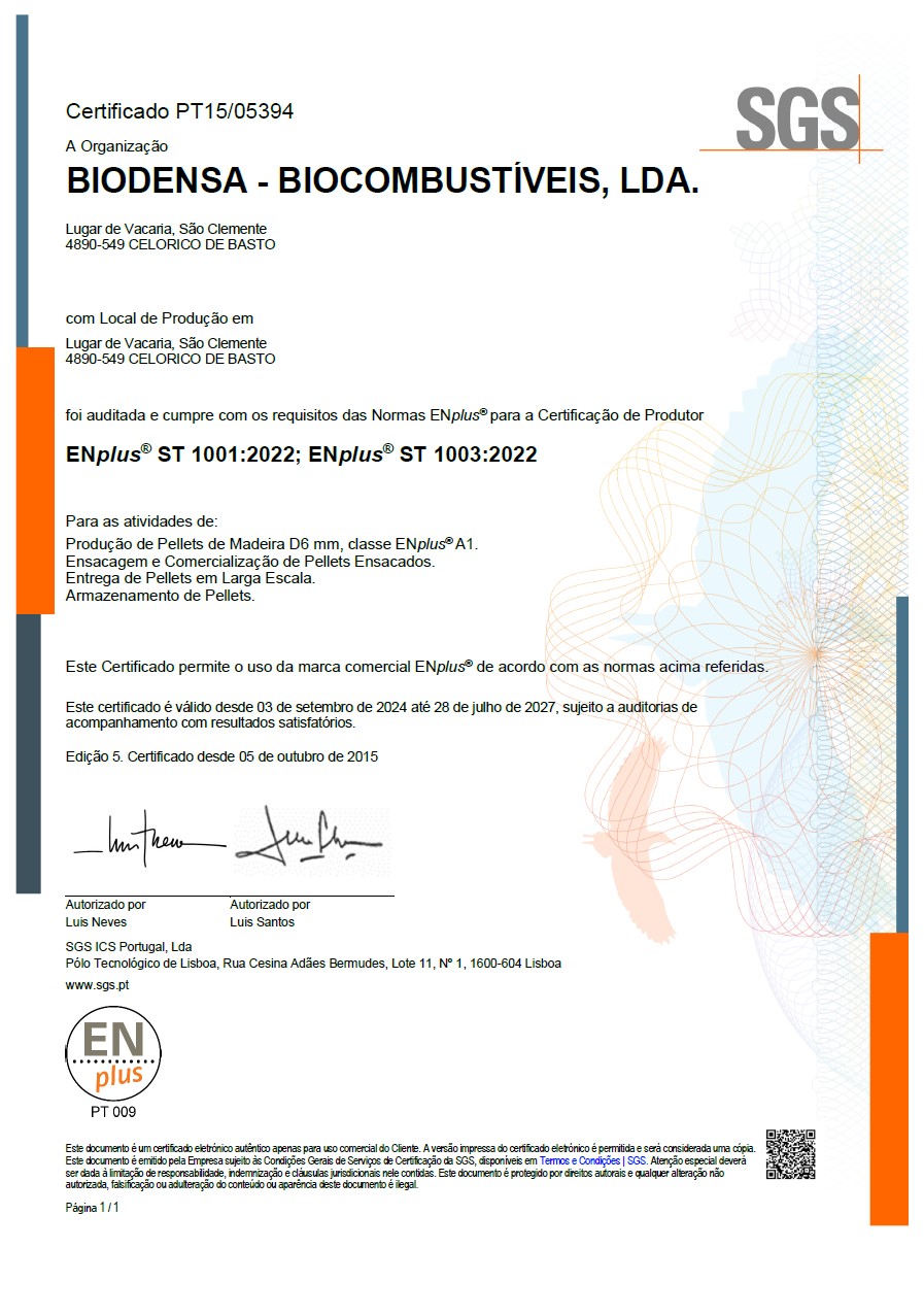 Devido à natureza da sua atividade a BIODENSA – BIOCOMBUSTÍVEIS, LDA optou também, pela certificação da marca ENplus® segundo a ISO 17225-2:2014 – “Solid biofuels; Fuel specifications and classes; Part 2: Graded wood pellets. Wood pellets for non-industrial use”, tendo como referência a Norma ST 1001 de modo a garantir a qualidade do produto comercializado, desde a sua origem até ao cliente final.